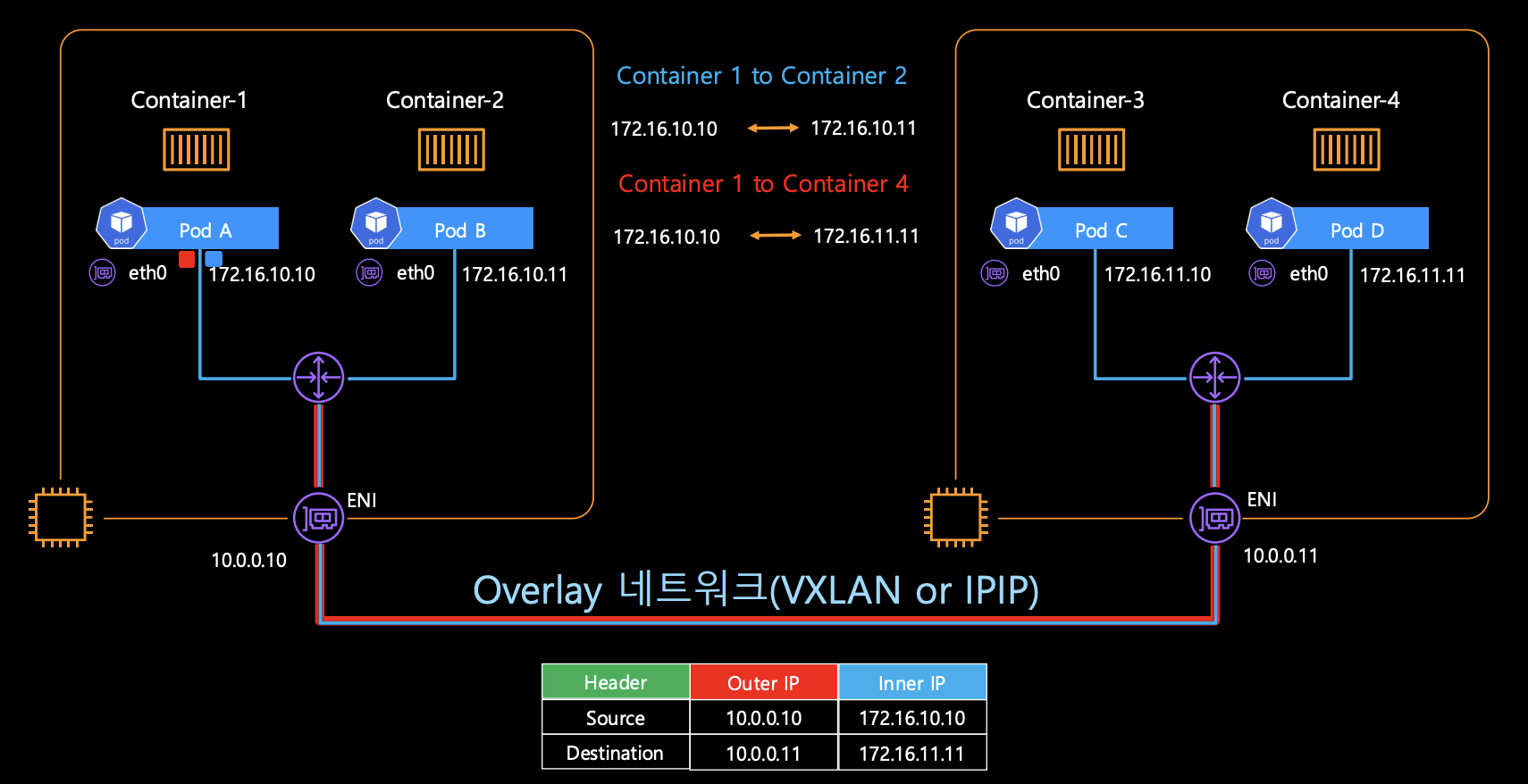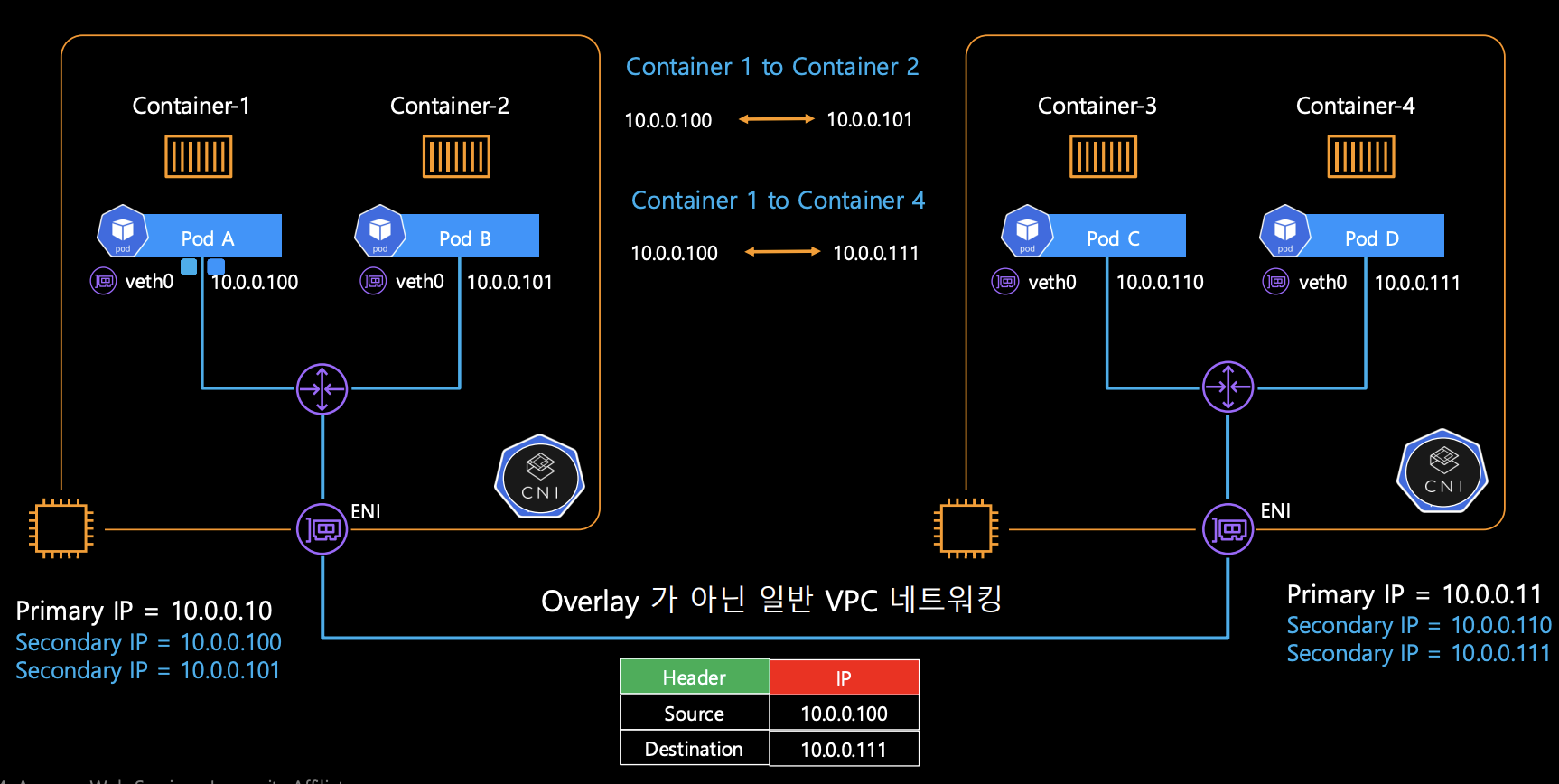 | 구분 | k8s (Overlay) | EKS VPC CNI |