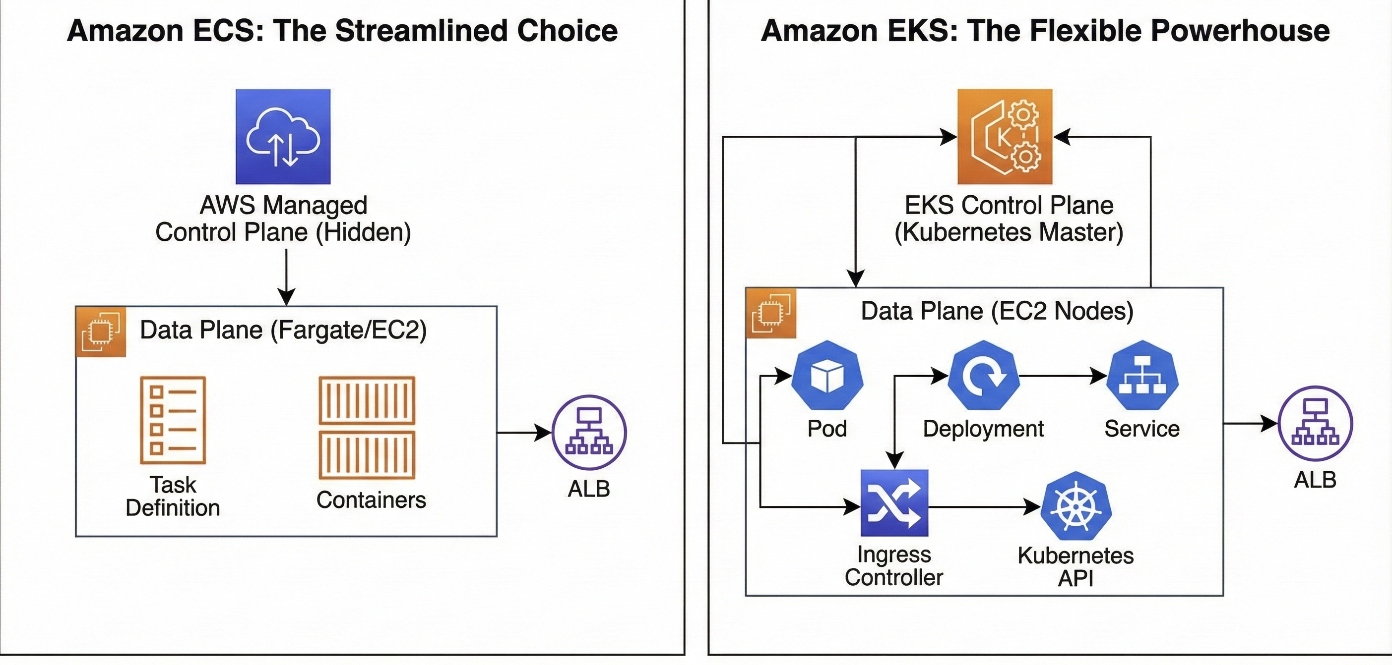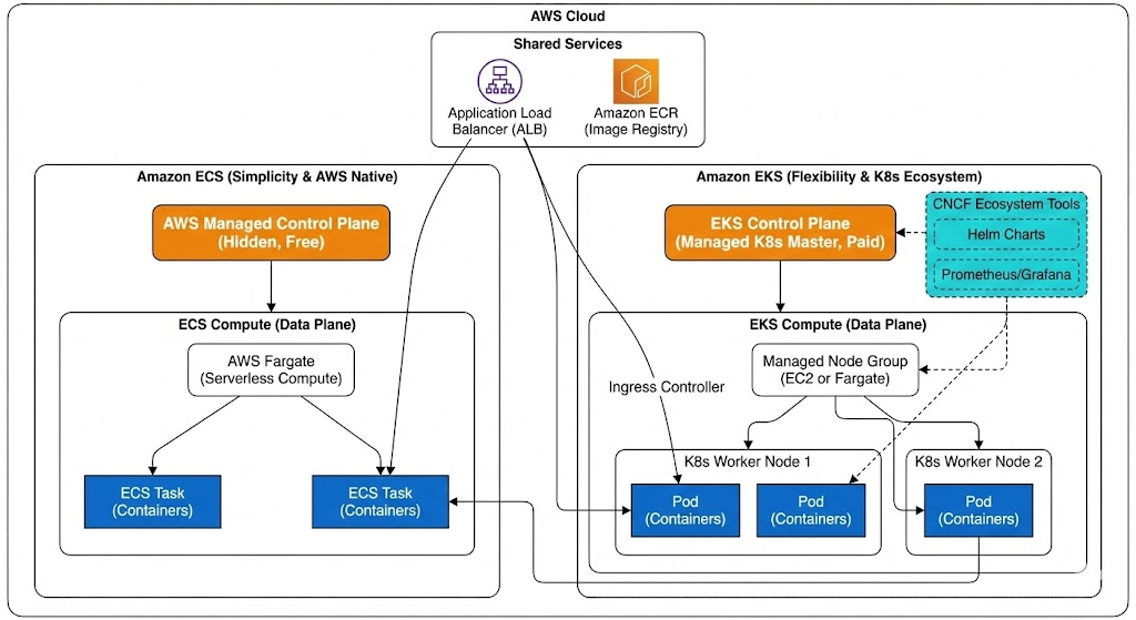 - 왼쪽 (ECS): AWS가 관리하는 숨겨진 Control Plane과 단순한 구조를 강조했습니다. 사용자는 Task 정의에만 집중하면 됩니다.