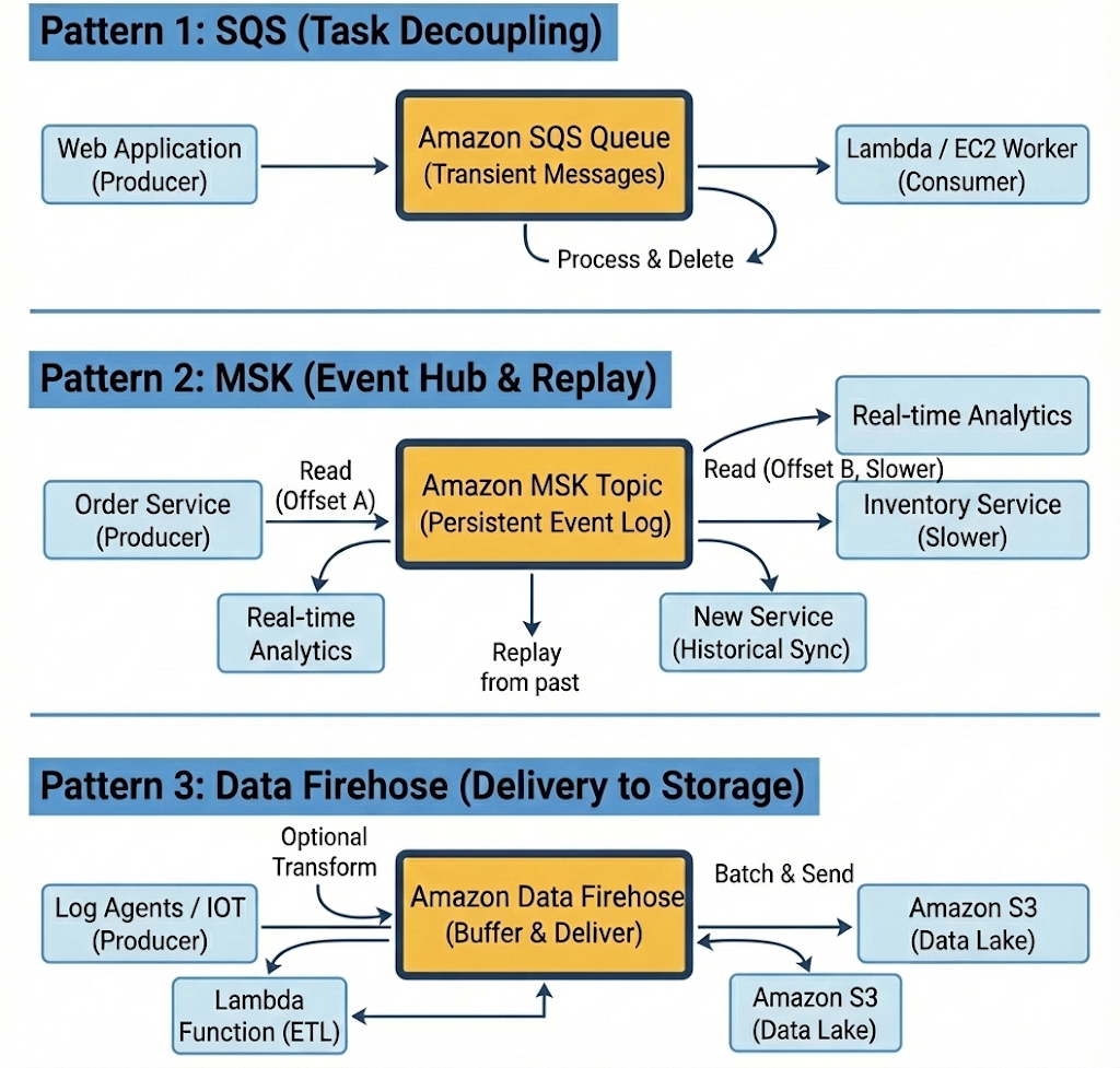 | 핵심 모델 | 메시지 큐 (Point-to-Point) | 이벤트 스트림 (Pub/Sub) | 스트리밍 전달 (Delivery Stream) |