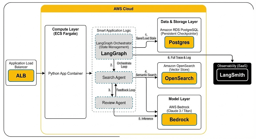 아래 구성도는 ECS 위에서 돌아가는 LangGraph 애플리케이션이 AWS 리소스 및 LangSmith와 어떻게 상호작용하며 '똑똑한 RAG'를 구현하는지 보여줍니다.