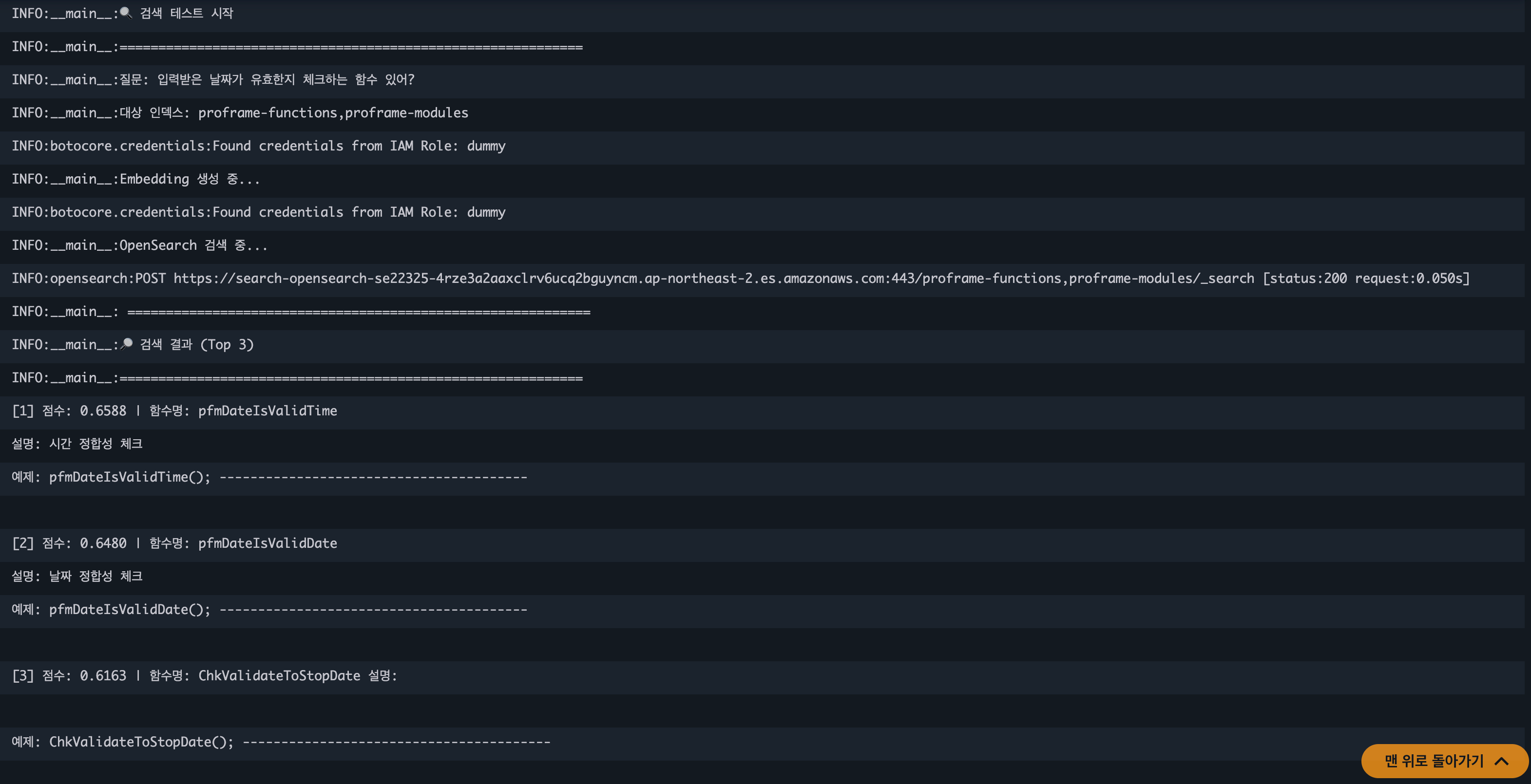 - 벡터 검색 (Semantic Search): "화면 갱신 로직 알려줘"와 같이 맥락과 의도를 파악해야 할 때 사용합니다. (Titan Embeddings v2 활용)