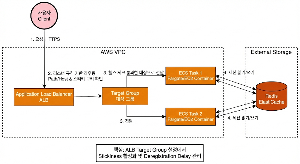 - [우선순위 2] ALB Stickiness (차선책): 만약 로컬 인메모리 캐시 사용 등 특수한 성능 이슈로 인해 어쩔 수 없이 요청을 특정 인스턴스로 고정해야 한다면, 차선책으로 ALB Target Group의 Stickiness 기능을 활성화합니다. ALB가 자체 쿠키(AWSALB)를 이용해 클라이언트를 특정 Task에 묶어줍니다.