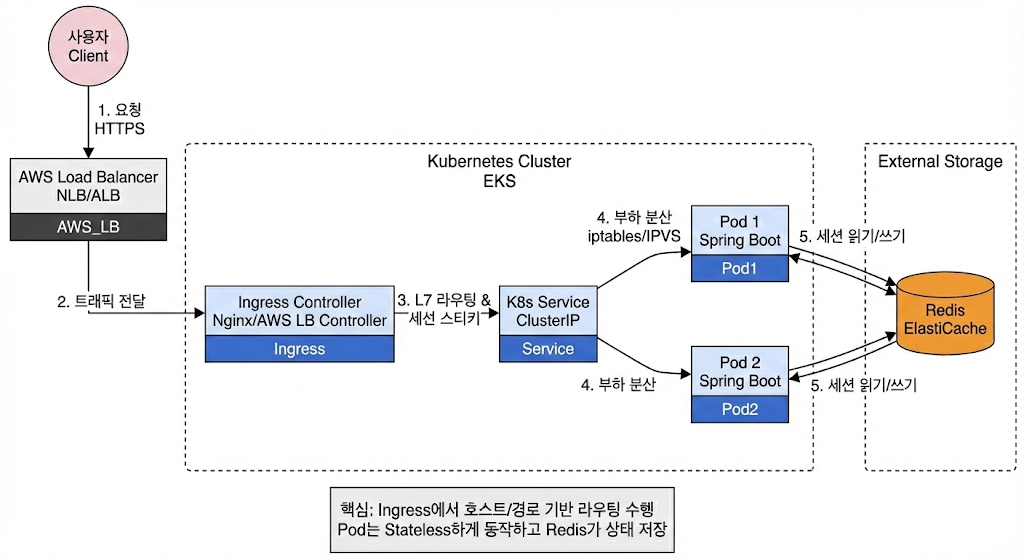 - [우선순위 1] Redis 기반 상태 분리: K8s에서도 제1원칙은 변함없습니다. Redis를 도입해 Pod가 세션 데이터를 들고 있지 않게 만들어야 합니다. 이렇게 하면 굳이 복잡한 Ingress 설정으로 트래픽을 특정 Pod에 고정할 필요 자체가 사라집니다.