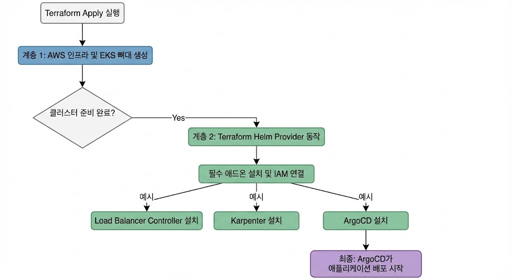 현대적인 EKS 구축의 핵심은 '인프라(Terraform)'와 '애플리케이션(GitOps)'의 역할을 분리하는 것입니다. 하지만 클러스터 생성 직후 마주하게 되는 로드밸런서 컨트롤러, Karpenter, ArgoCD 같은 필수 애드온 설치와 복잡한 IAM 권한(IRSA) 설정은 운영자에게 큰 부담이 됩니다.