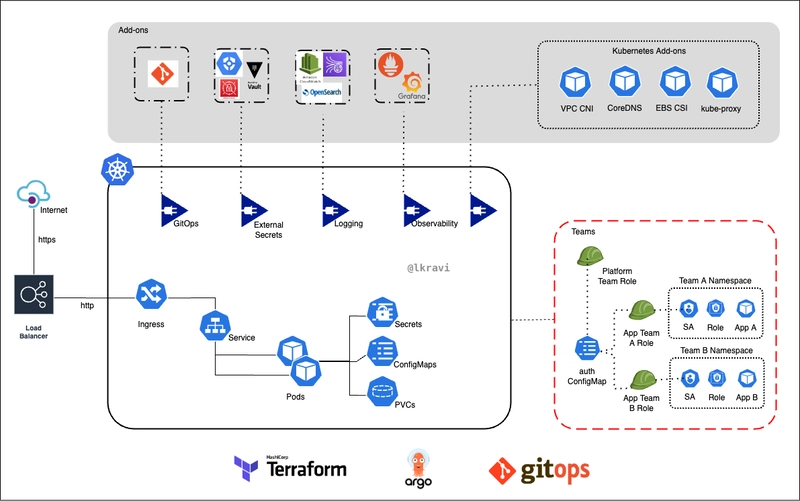 EKS Blueprints는 우리가 앞서 논의한 "역할 분리" 패턴을 아주 잘 따르고 있으며, 이를 두 개의 계층으로 명확히 나눕니다.