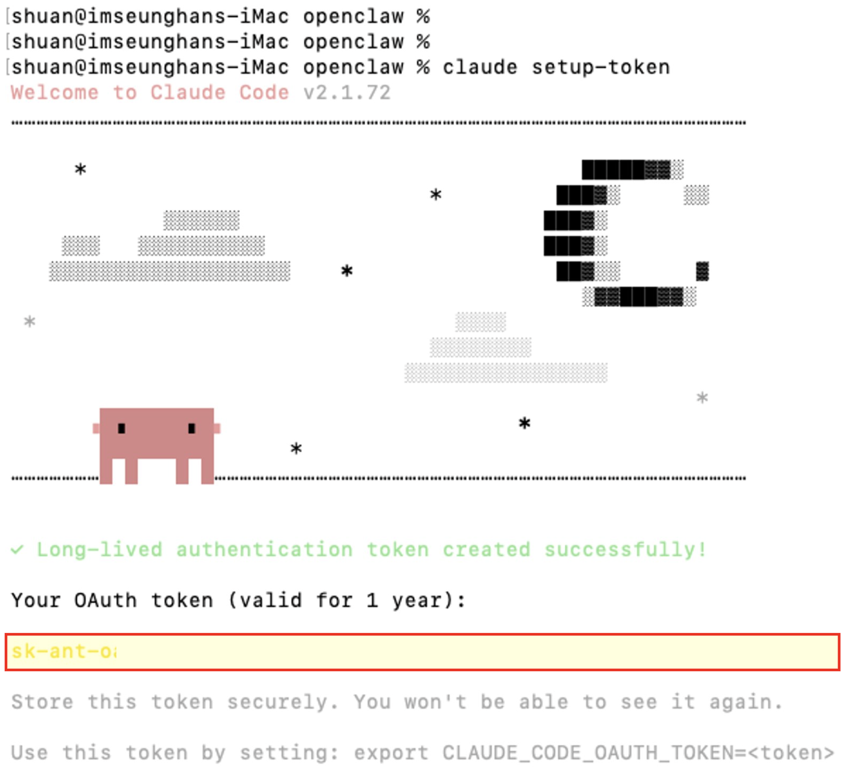 인증 후 다시 터미널로 돌아오면 긴 토큰(Token) 문자열이 출력되어 있습니다. 토큰을 복사하여 OpenClaw 설정 창의 "Anthropic token" 입력란에 붙여넣으면 연동이 완료됩니다.