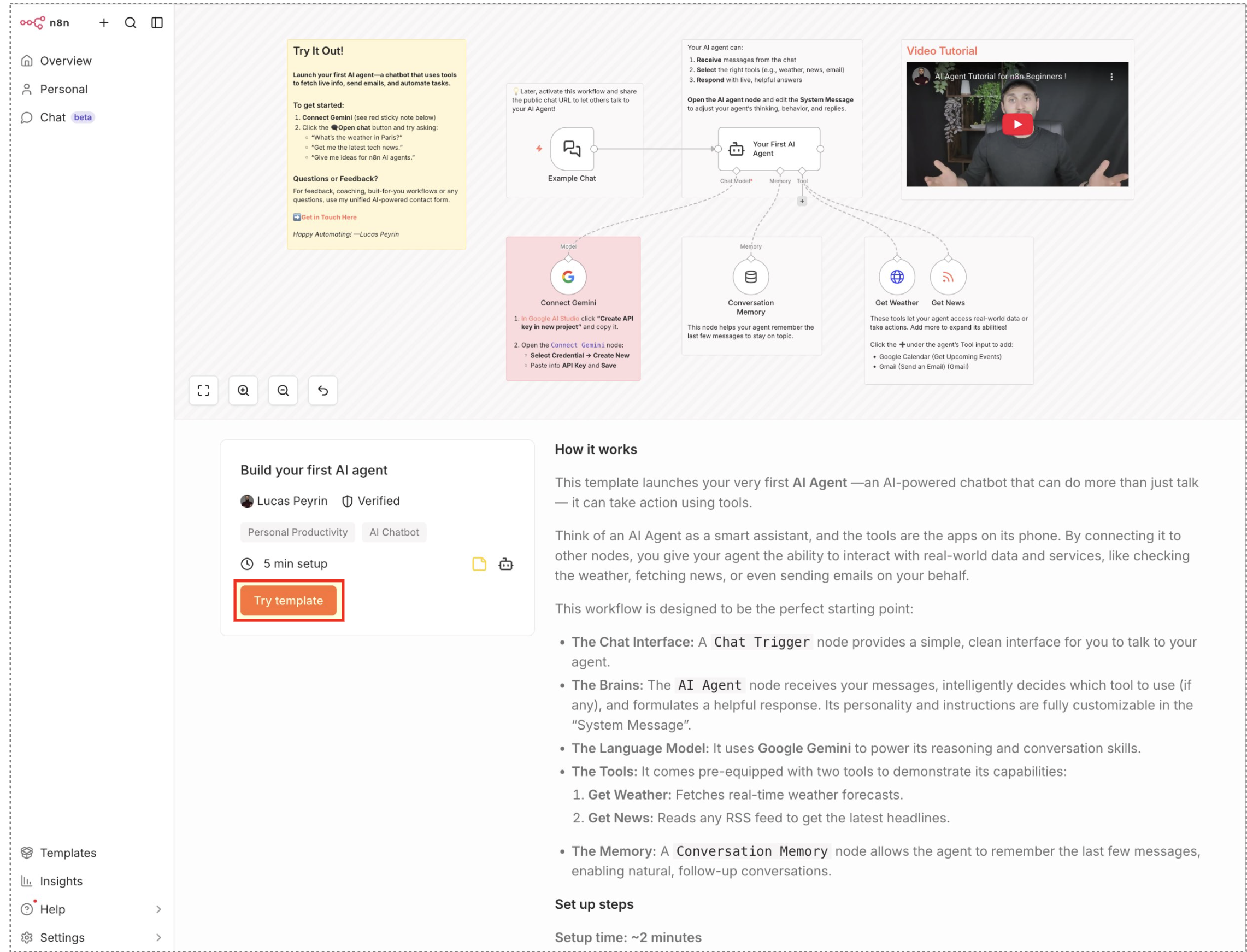 이론은 이쯤 하고, 실제로 작동하는 예제를 만들어 봅시다. n8n에서 공식 제공하는 "Build your first AI agent" 템플릿을 활용해 날씨와 뉴스를 가져오는 스마트 비서를 구축해 보겠습니다.