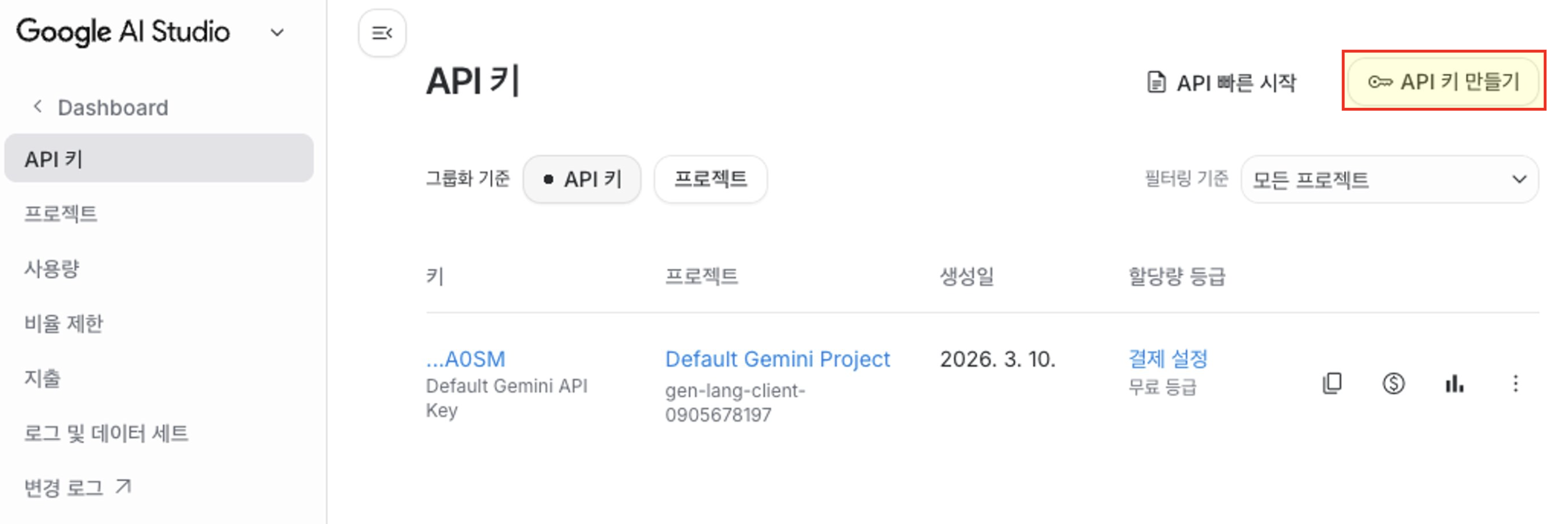 - aistudio.google.com/app/apikey 에 접속합니다.