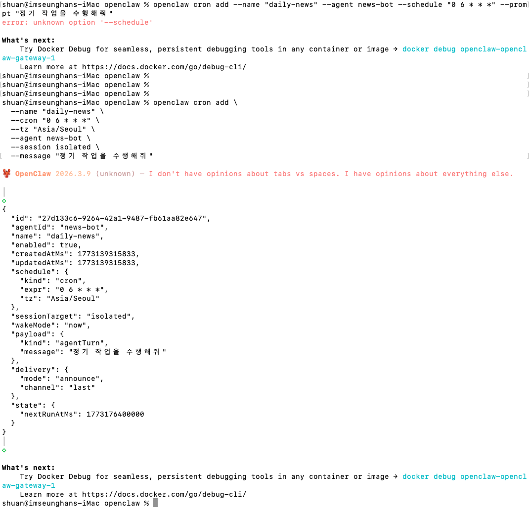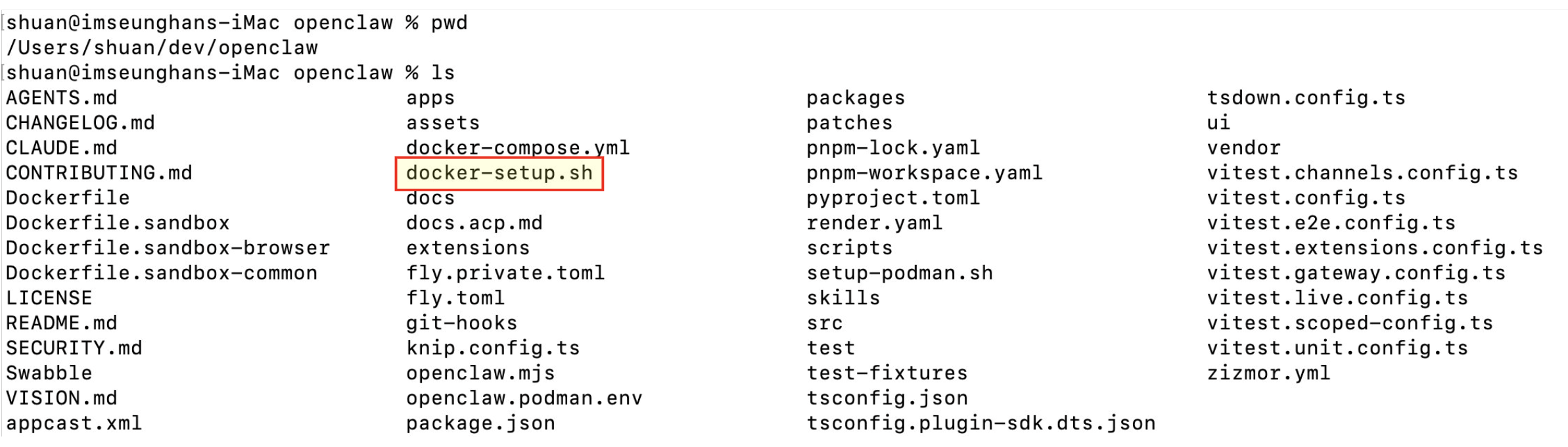 Docker 환경에서는 openclaw 명령어를 매번 docker exec으로 실행해야 합니다. 매번 치기 번거로우니 "~/.zshrc"에 alias를 등록해두면 편리합니다.