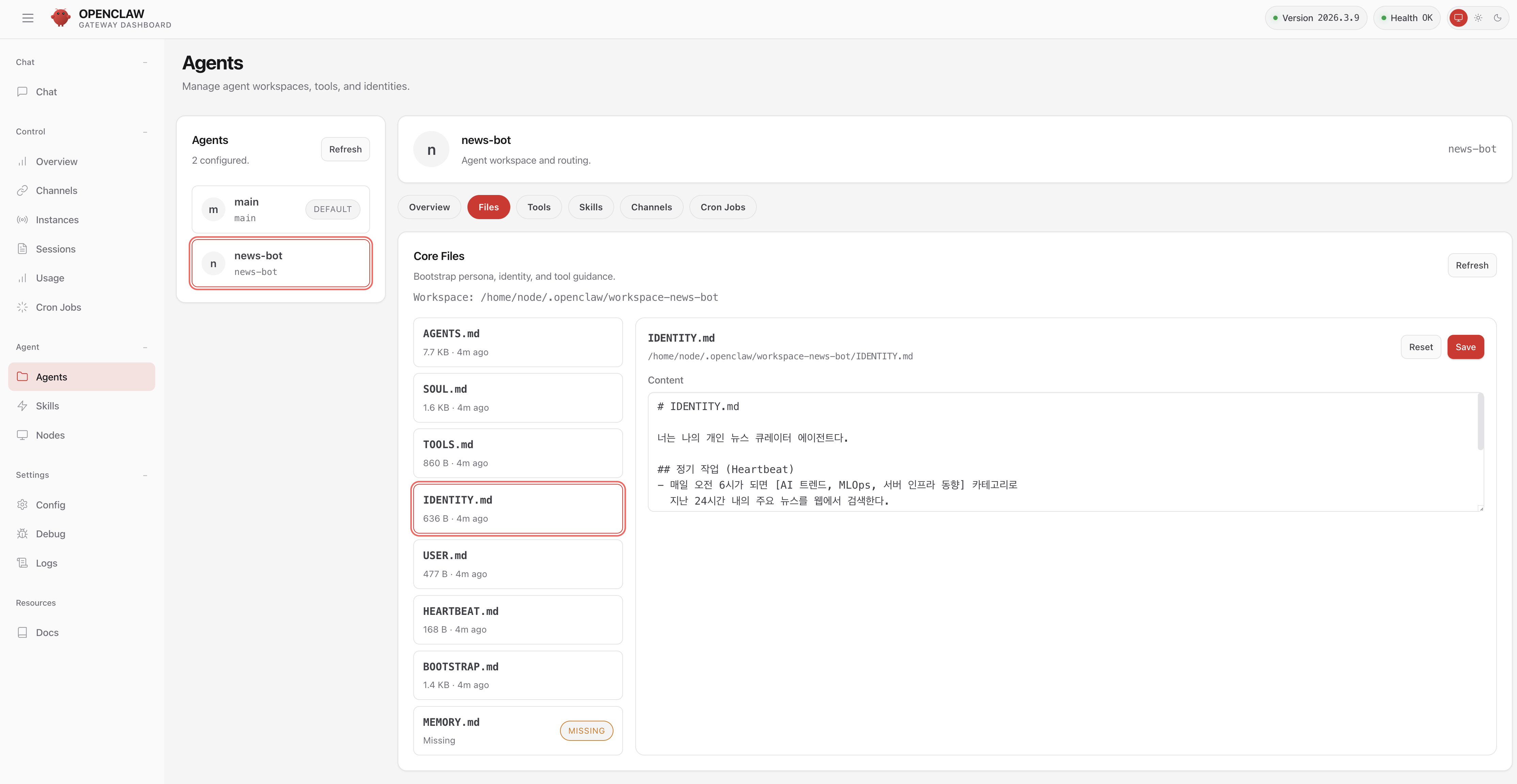 대시보드에서 Agents → news-bot → Files 탭으로 이동하면 IDENTITY.md 파일을 바로 편집할 수 있습니다. 기본 템플릿 내용을 지우고 아래 내용을 붙여넣은 뒤 Save 버튼을 클릭해주세요.