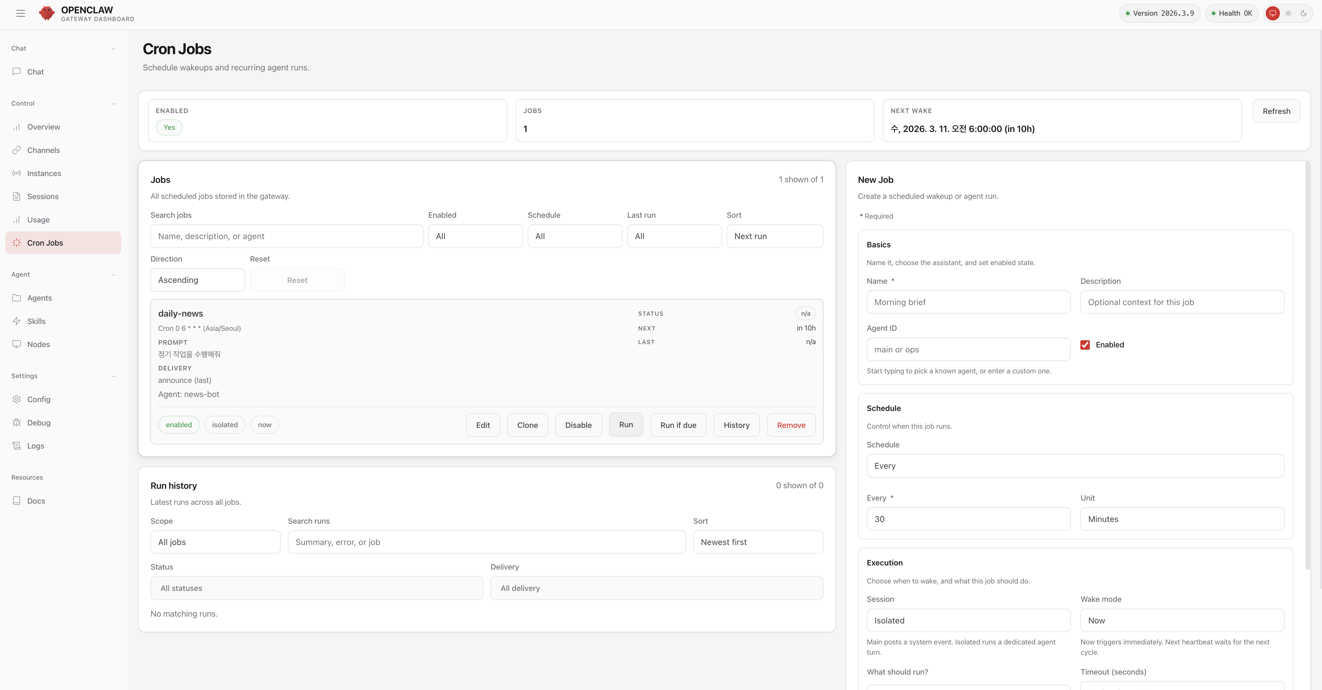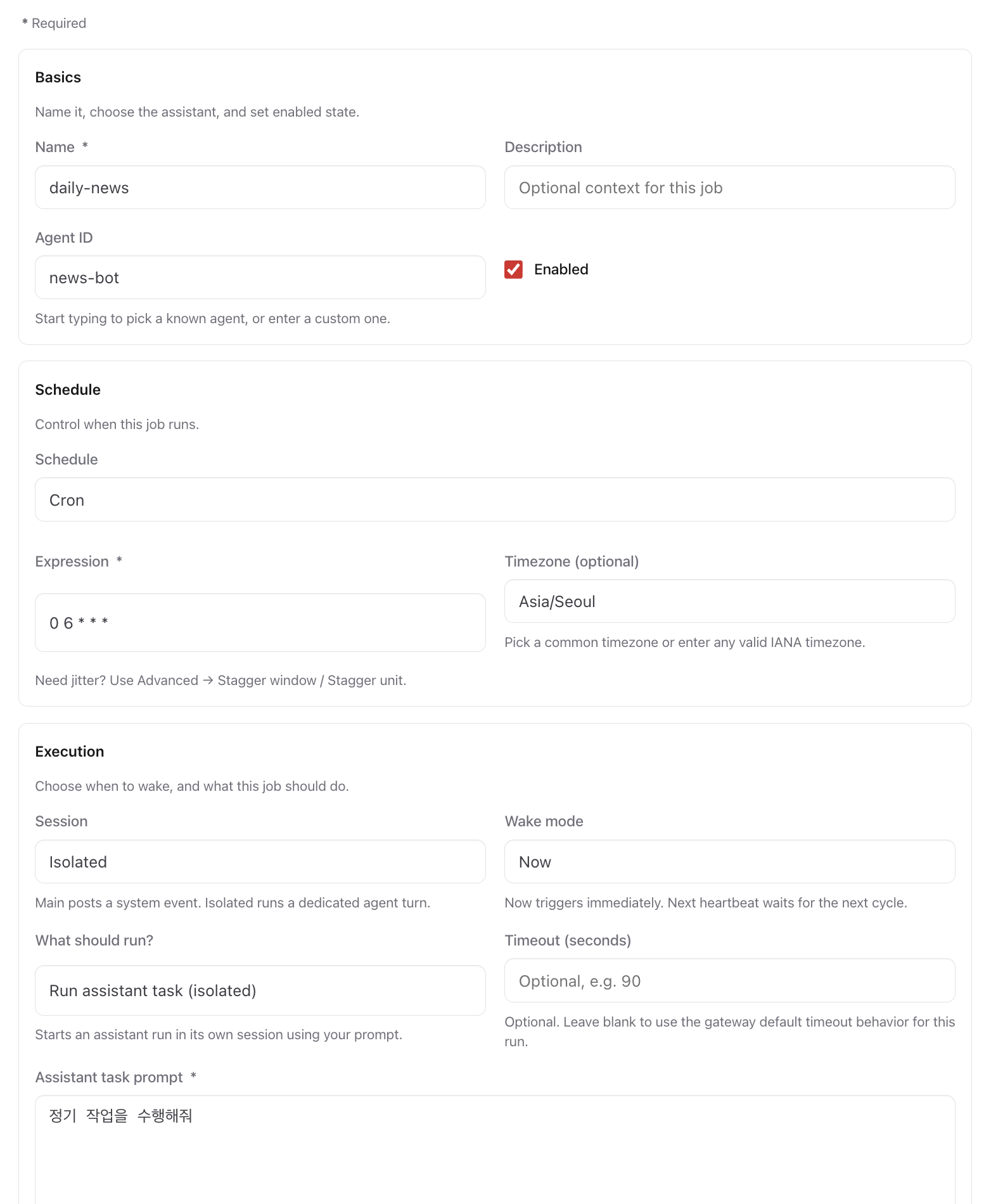 이제 OpenClaw를 이용해 매일 오전 6시에 글로벌 AI 및 서버/인프라 뉴스를 수집하고, 요약본을 Gmail로 전송하는 에이전트를 만들어 보겠습니다.