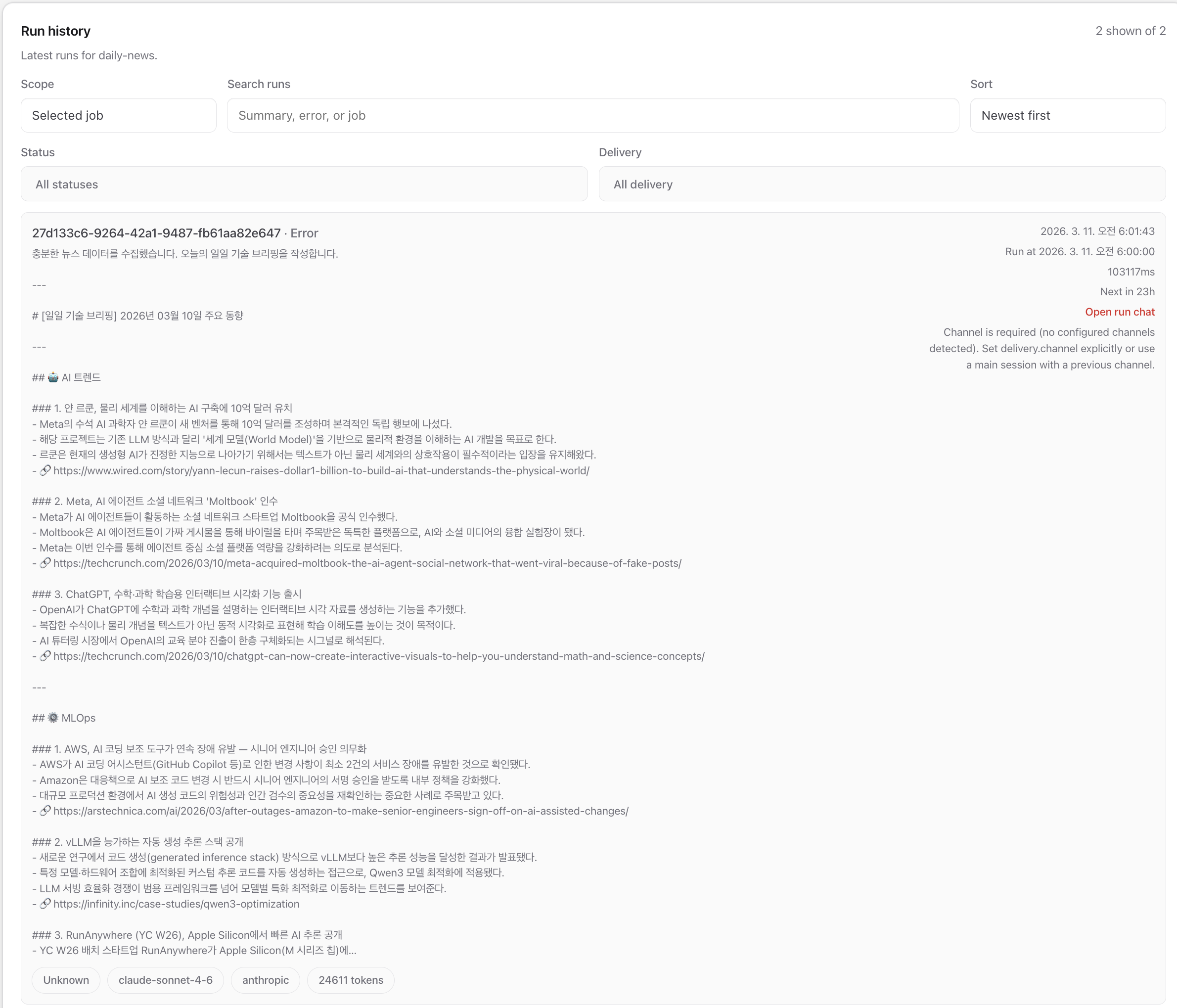 매일 아침 AI 및 서버/인프라 분야의 주요 뉴스를 수집하고 요약해서 보고한다.