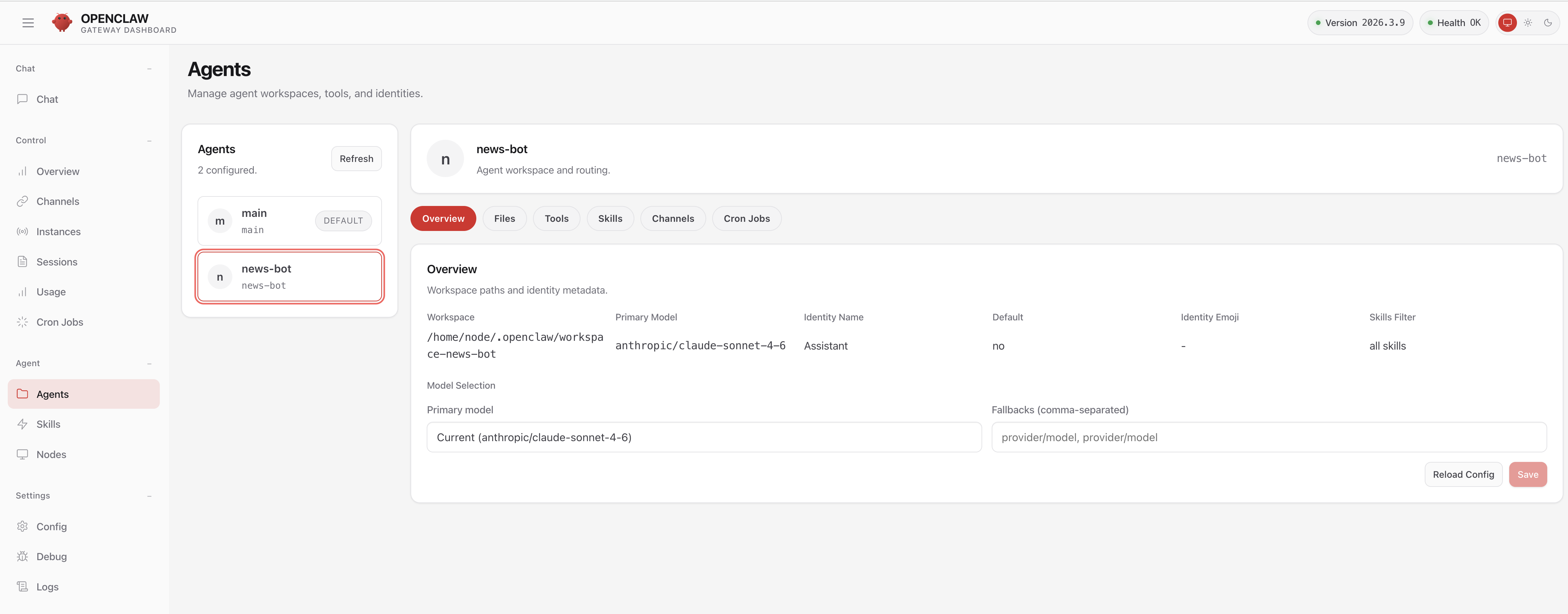 생성 후 대시보드 Agents 메뉴에서 Refresh를 누르면 news-bot이 목록에 나타납니다.