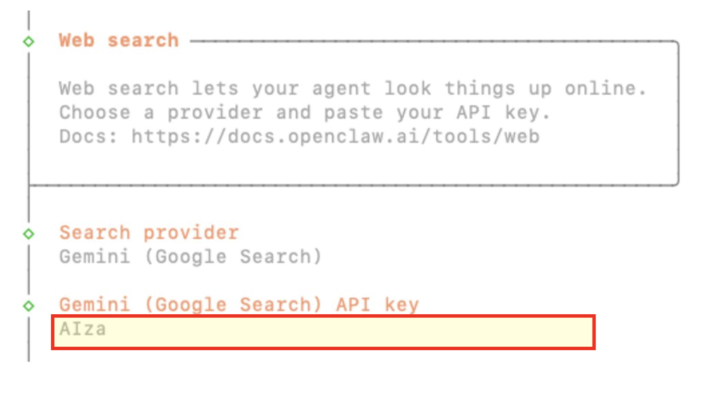 설치 과정(또는 npx openclaw configure --section web)에서 검색 제공업체를 Gemini (Google Search)로 선택하고, 복사한 API 키를 붙여넣습니다.