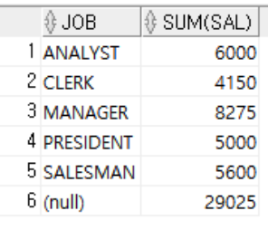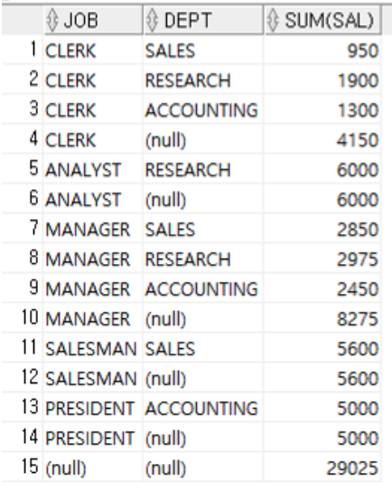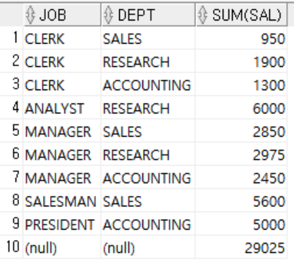 SELECT JOB, DEPT, SUM(SAL)