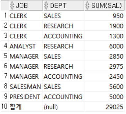 SELECT DECODE(JOB, NULL, '합계', JOB) JOB, DEPT, SUM(SAL)