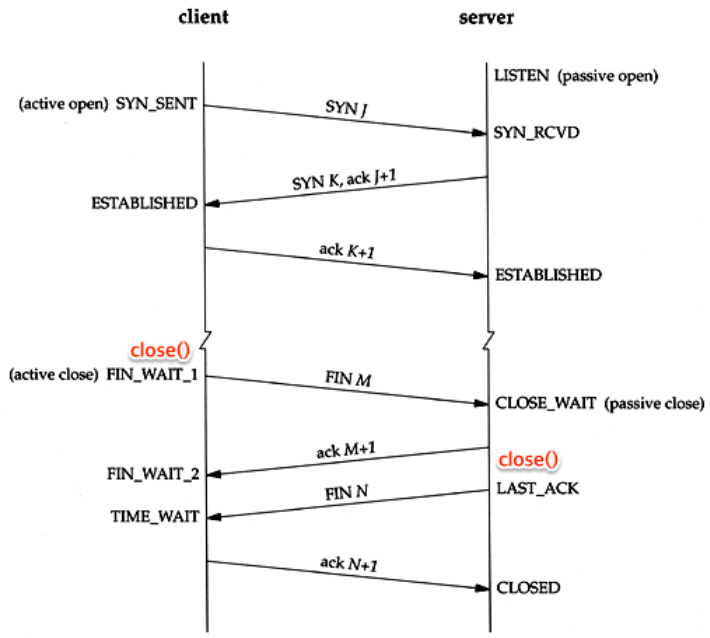 이 중 ESTABLISHED 이후 종료 과정에서 어플리케이션의 close() 호출 부분을 추가로 표시해봤다. Active Close 쪽이 먼저 close()를 수행하고 FIN을 보내면 Passive Close 쪽은 ACK을 보낸 후 어플리케이션의 close()를 수행한다. 보다 상세한 과정은 아래와 같다.