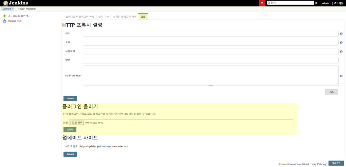 c) 고급 탭 클릭 & 플러그인 올리기에 다운로드 받은 파일(*hpi) 업로드
