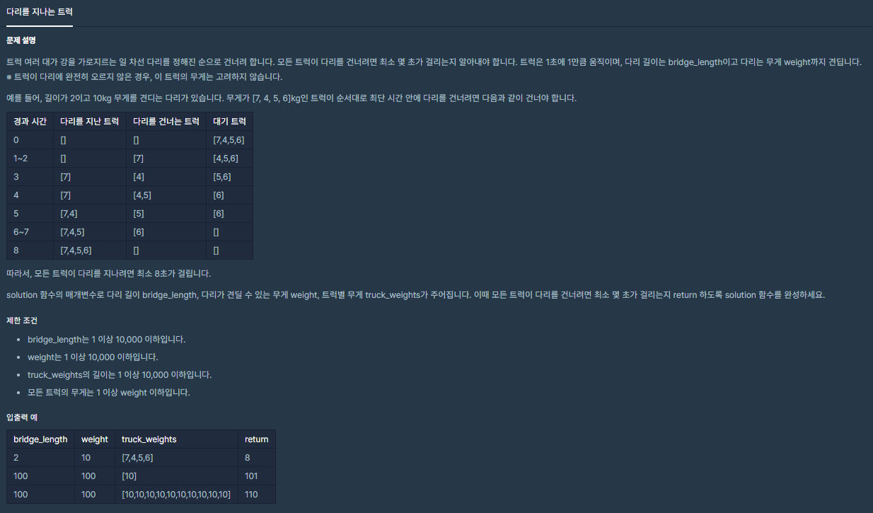 이 경우는 Queue가 가득차 있다는 의미이며 동시에 가장 먼저 진입한 트럭이 다리의 끝자락에 다다랐다는 의미기도 하다.