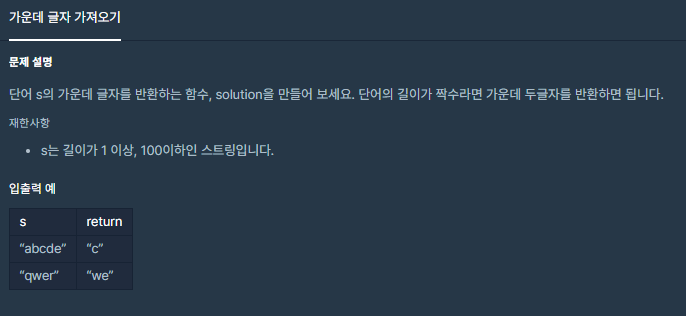 입력받은 String 길이를 2로 나눠 문자열 길이의 홀/짝을 구분하고 substring method로 결과값을 반환한다.