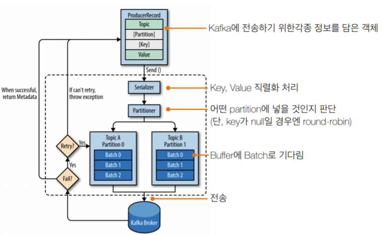 - 프로듀서가 브로커와 소켓연결을 맺고, 메시지를 보낸 즉시 성공으로 간주