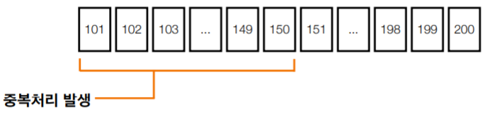 → 컨슈머 재시작, 다시 오프셋 101부터 처리 시작, 101번~150버 중복처리