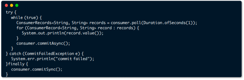 → exception이 발생하면 마지막에 처리하던것을 commitSync()하고 consumer.close()를 이용하여 안전하게 종료하게 된다.