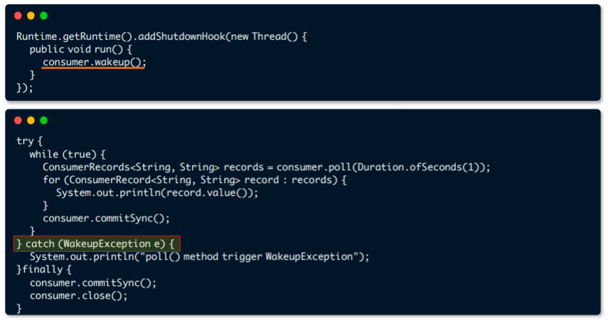컨슈머를 정상적으로 종료시키기위해 wakeup 메소드를 사용한다.