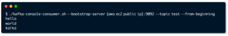 $ bin/kafka-console-consumer.sh --bootstrap-server 카프카IP:9092 --from-beginning --topic 토픽명