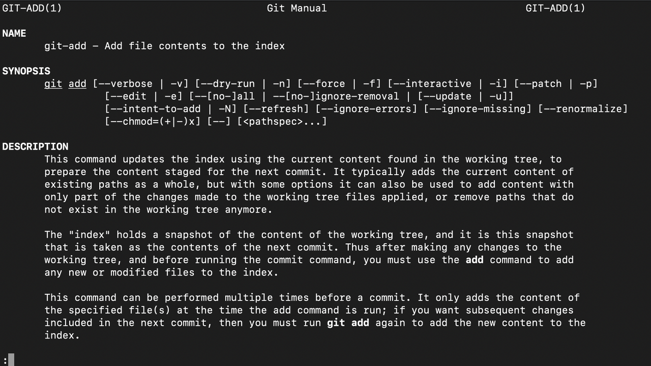 의 형식으로 쓰면 되는데요. 예를 들어, git add라는 커맨드의 의미와 사용법을 좀더 자세히 알고 싶다고 해봅시다.