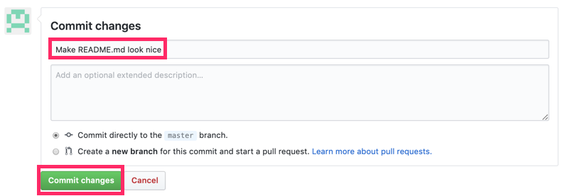 그리고 이렇게 이 상태에서 "Make README.md look nice"라는 커밋 메시지로 커밋을 할게요.
