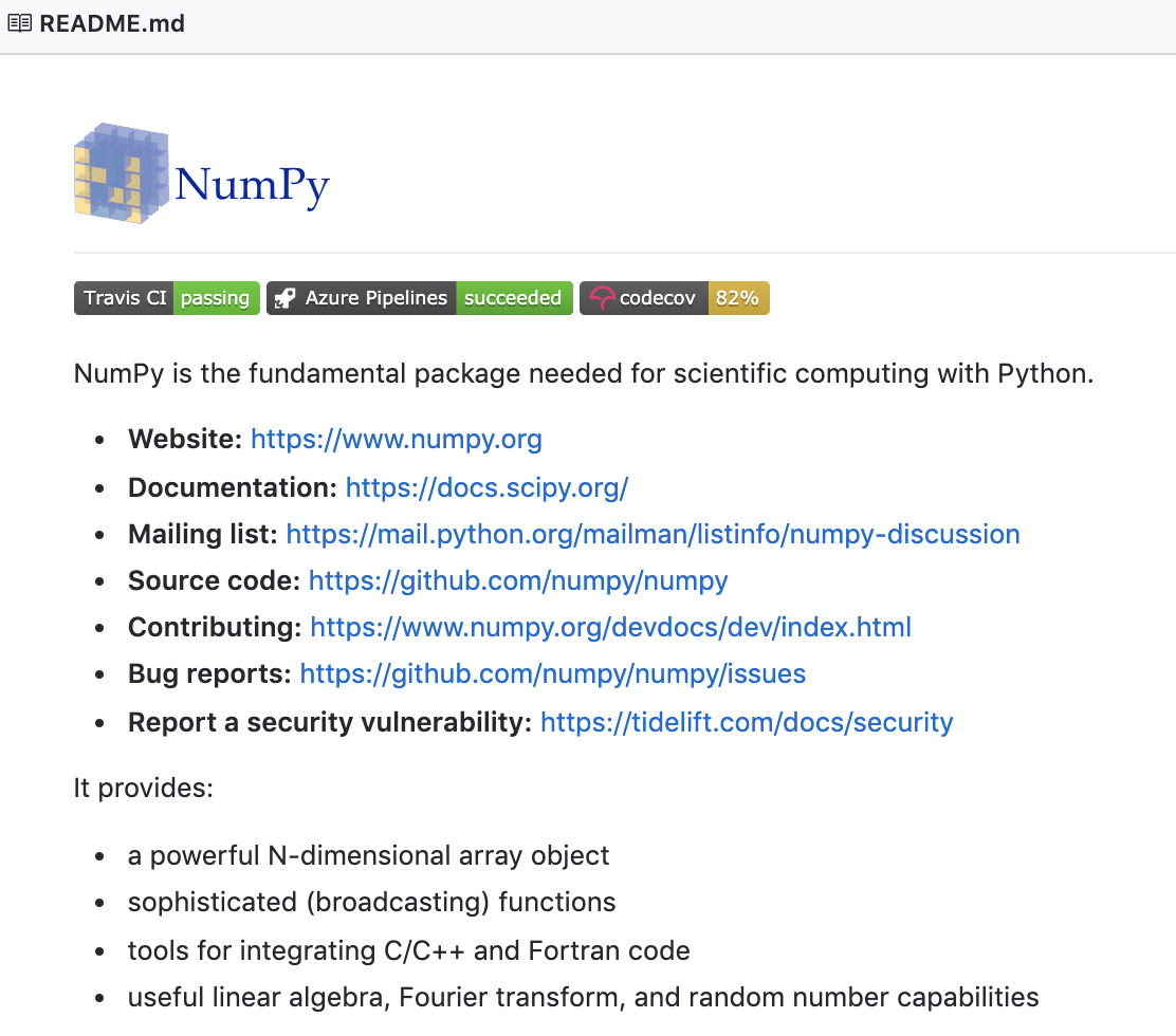 이전 영상에서 Numpy 프로젝트를 살펴볼 때 아래 그림과 같은 README.md 파일을 봤습니다.