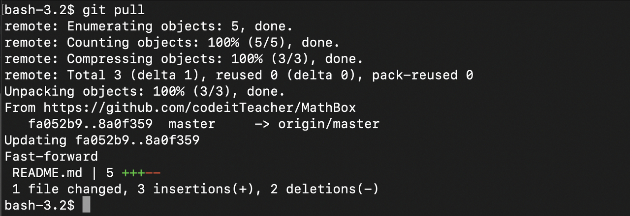 이렇게 하면 리모트 레포지토리의 최신 커밋이 로컬 레포지토리에도 잘 반영됩니다. 바로 다음 레슨으로 가봅시다.