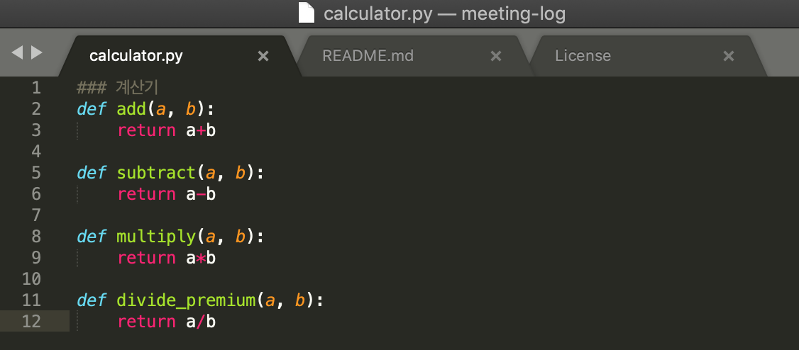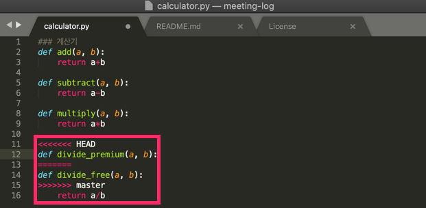 Conflict 표시가 말끔히 사라지고 premium 브랜치에 있던 calculator.py의 원래 모습 그대로 즉, 머지를 시도하기 이전 모습으로 돌아옵니다.