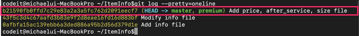 지금 빨간색 박스 안의 커밋(세번째 커밋)에서 어떤 상품의 정보를 담기 위한 파일 3가지(price, after_service, size)를 만들었습니다.