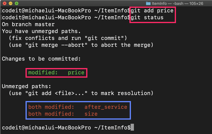 price 파일은 conflict를 해결하고 staging area에 올려주었기 때문에 커밋할 수 있는 파일이라는 걸 확인할 수 있습니다. 이렇게 conflict가 해결된 상태를 resolved(해결된) 상태라고 말하기도 합니다.