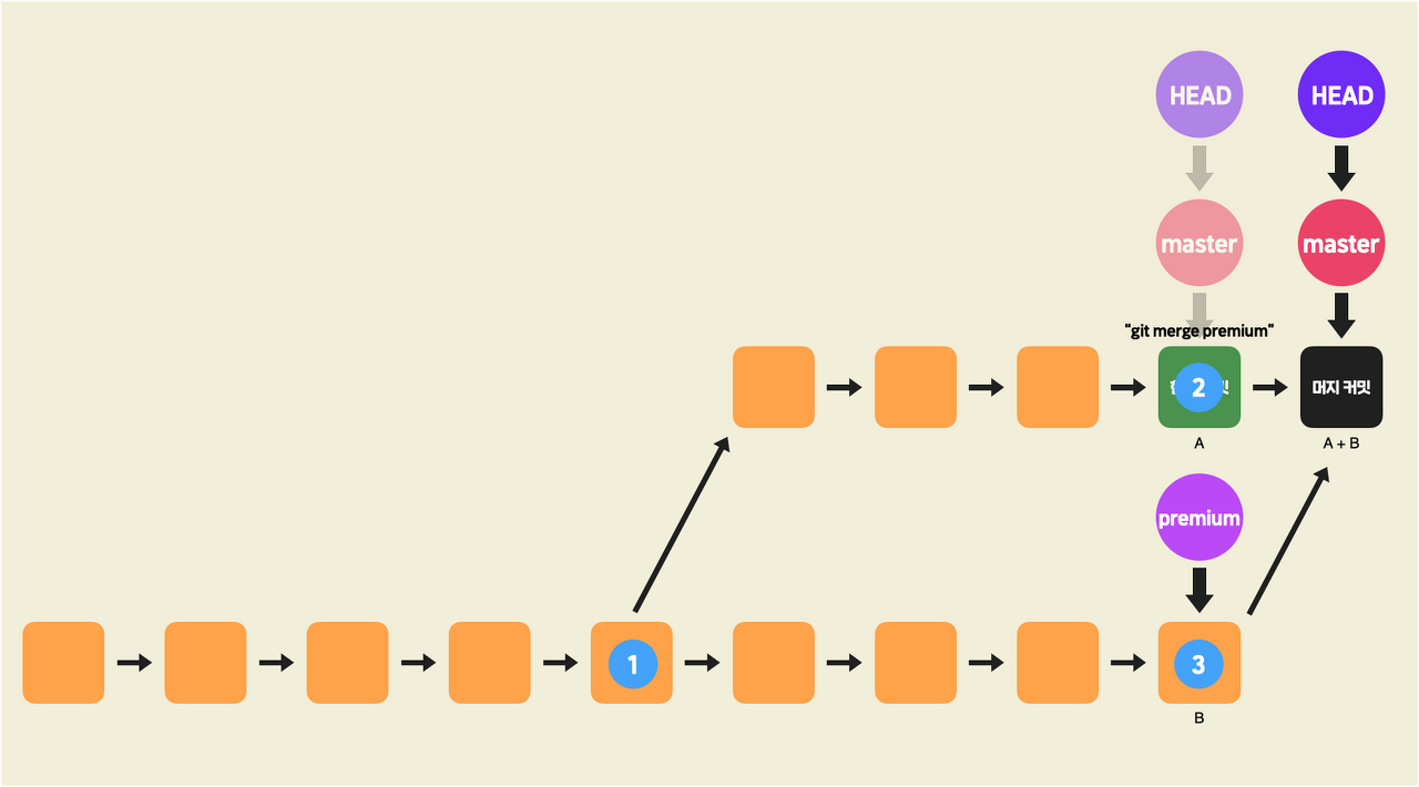 - 머지 결과 : master 브랜치에서 premium 브랜치를 머지했을 때의 최종 결과