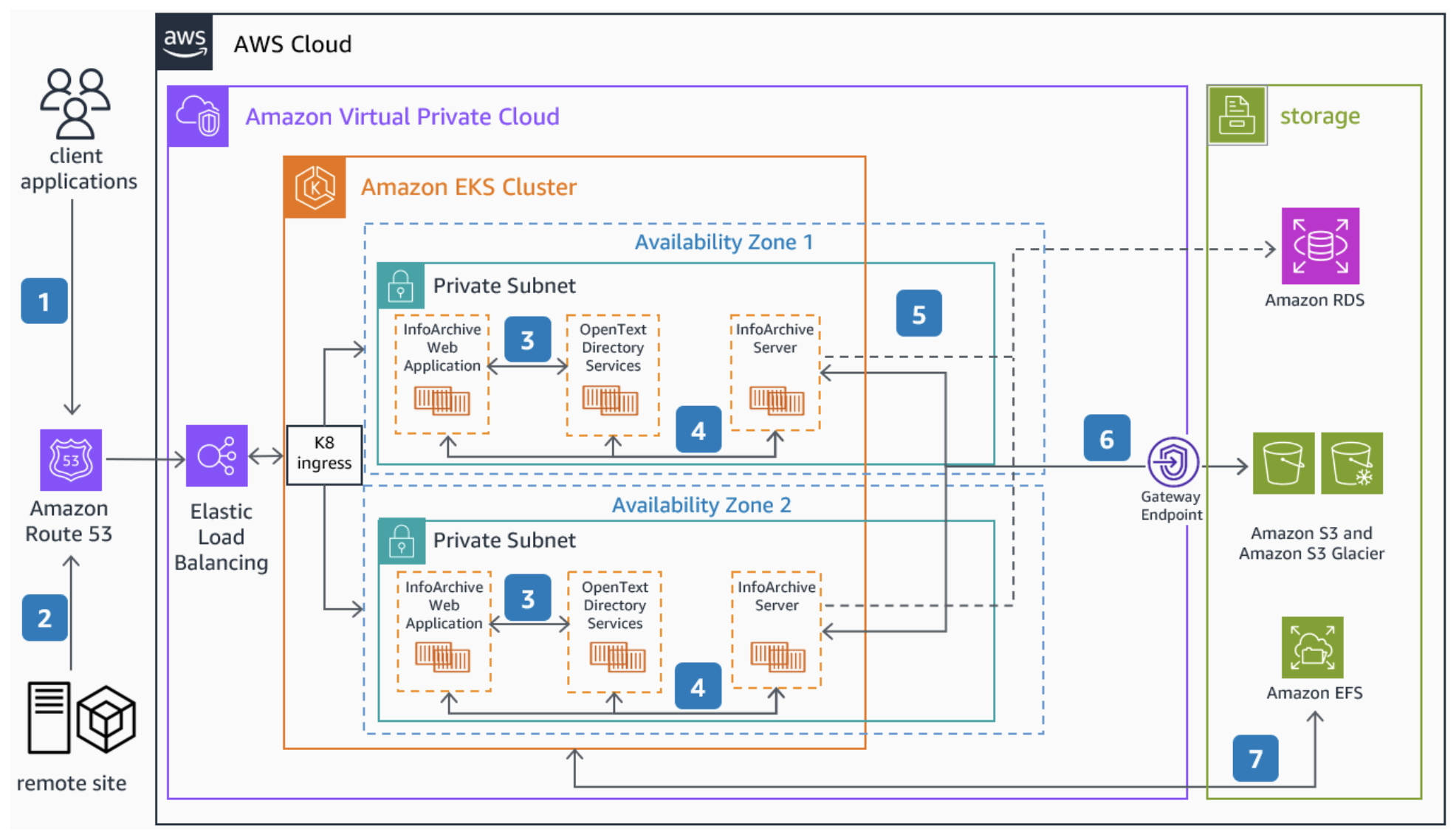 - Amazon Elastic Kubernetes Service (EKS): InfoArchive의 웹 애플리케이션, OpenText Directory Service(인증 및 권한 부여), 그리고 InfoArchive 서버를 호스팅하는 데 사용됩니다. Amazon EKS 클러스터는 애플리케이션의 높은 가용성을 보장하기 위해 두 개의 AWS 가용성 구역(AZ)에 걸쳐 개인 서브넷에 배포됩니다.