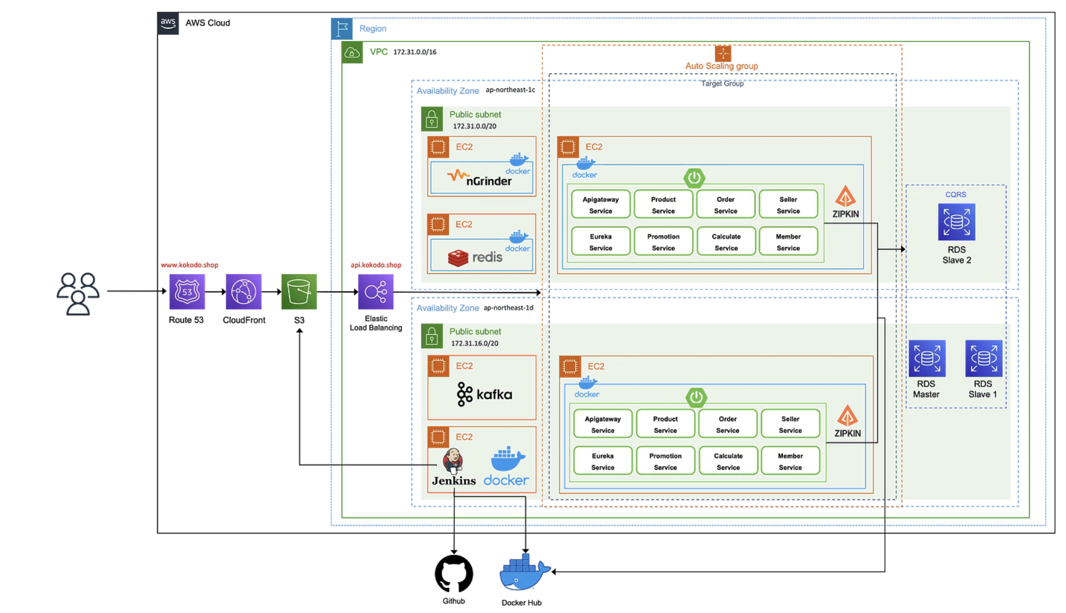 - 정적 자산은 Amazon S3에 저장되고, CloudFront를 통해 전 세계적으로 전달