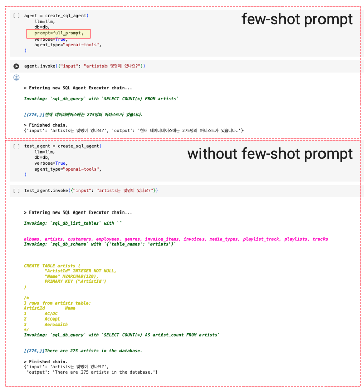- 따라서 도메인특화지식(domian-specific knowledge)을 갖고 있을 경우, 그것을 잘 녹여낸 few-shot prompt를 같이 넣어주게 되면 훨씬 효율적으로 SQL Agent를 활용할 수 있다.