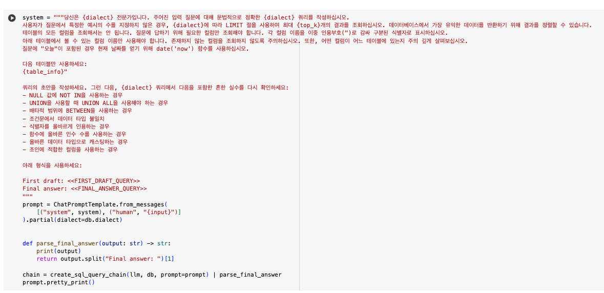 - 최종적으로 LLM(GPT3.5)와 vector DB, system prompt를 연계하여 create_sql_agent 라는 모듈을 생성한다.