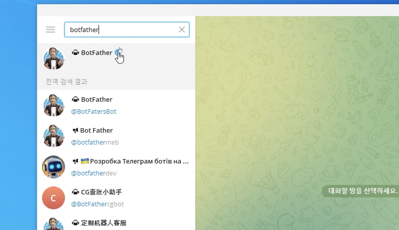 - 텔레그렘에서 'botfather'를 추가한다.
