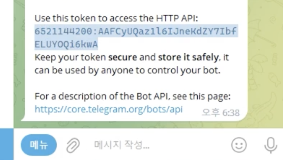 - telegram api ๊ฐ์ด๋: https://core.telegram.org