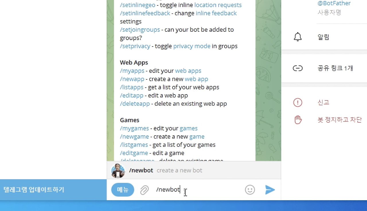 - ํ ๋ ๊ทธ๋ ์์ 'botfather'๋ฅผ ์ถ๊ฐํ๋ค.