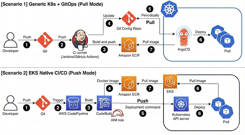 | 특징 | [시나리오 1] K8s + GitOps | [시나리오 2] EKS Native CI/CD |