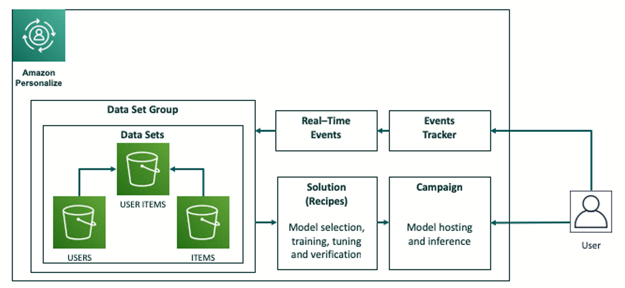 - Amazon Personalize는 데이터셋 그룹의 데이터를 사용하여 추천 모델을 훈련합니다.